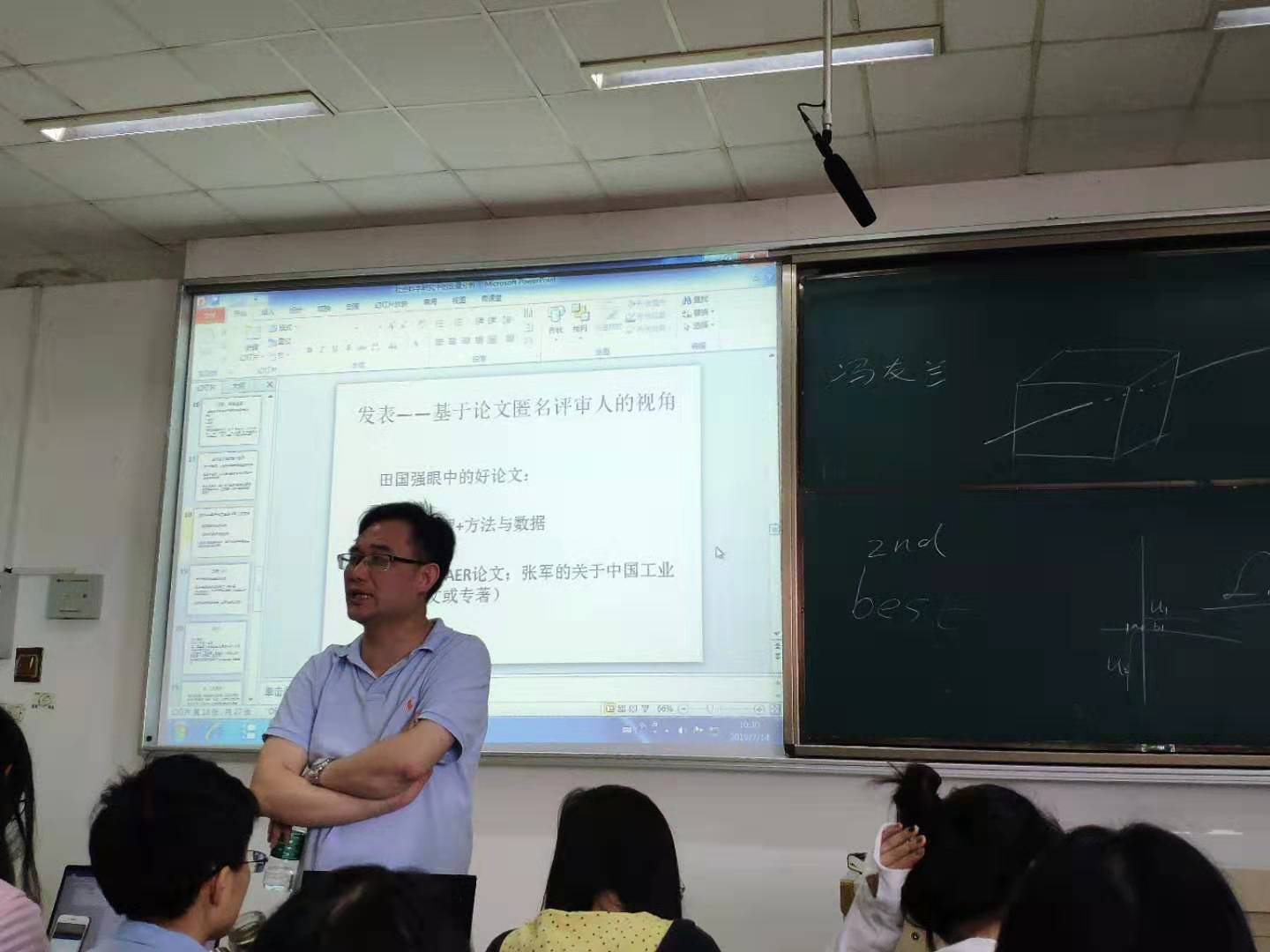 的学员们带来题为“社会科学中的定量方法”的报告。在报告中,邱斌教授介绍了社会科学中的常见理论研究方法,指出随着现代实证分析技术的发展,将定量方法引入社会学科学领域为社会科学的发展提供了的新的源动力。随后邱教授分别从社会科学研究中选题、研究方法、结论阐述等方面为学员们提供了方法指导。