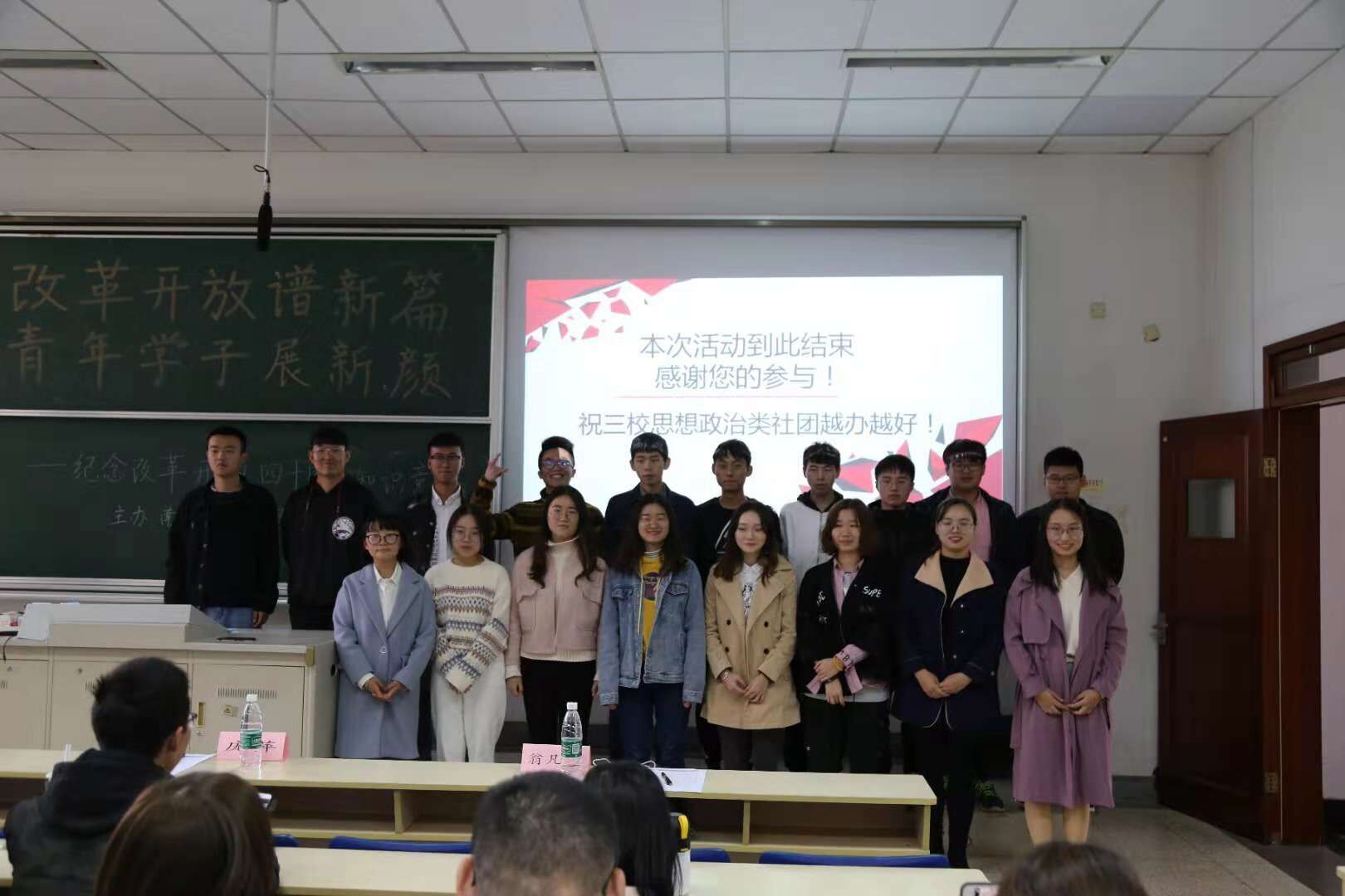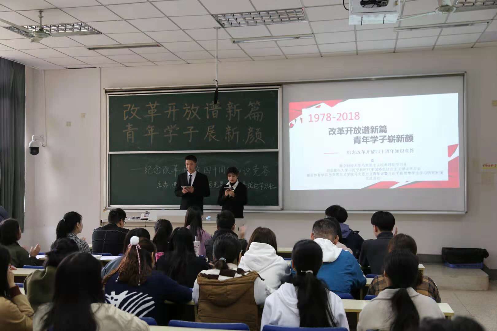 11月11日下午,海立方娱乐城 马克思主义经典理论学习社联合南京邮电大学习近平新时代中国特色社会主义思想学习会、南京体育海立方娱乐城 习近平新思想学生学习研究社,在德经楼101举行了“改革开放谱新篇,青年学子展新颜”——庆祝改革开放四十周年知识竞答活动,海立方娱乐城 党员、入党积极分子们到场观看了比赛。 活动正式开始前,海立方娱乐城 马克思主义学社社长庞萍、南邮习学会会长吴忧、南体马院新思想研习社团社长翁凡棋依次进行了发言。首先,庞萍同学以主办方身份对来自南邮、南体的社团同仁们表示了热烈的欢迎和衷心的感谢,同时对此次知识竞答活动提出了要求和期望,并表示希望今后加强三校思想政治类社团的交流与合作。吴忧同学对社团的未来发展方向提出了热切展望,翁凡棋同学则表示希望加强社团间的联系并欢迎兄弟院校社团去南体进行交流。 本次庆祝改革开放四十周年知识竞答活动分为必答题、抢答题和风险题三个环节。选手们一个个你追我赶、不甘示弱,对改革开放四十年的历史都有较好的理解和掌握,场上竞争十分激烈。经过激烈的角逐,南财队获得了卓越青年奖,南邮、南体则分别精神文明奖和思想进步奖。活动最后进行了各队的颁奖和合影环节。 此次改革开放四十周年知识竞答宣扬了改革进取的创新精神,促进了青年学子对相关历史的深入了解,展现了当代青年学子积极向上的精神风貌。