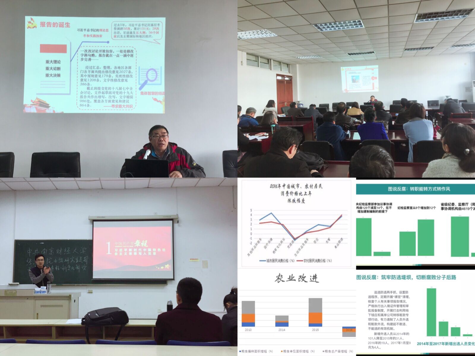 开展了“一张统计图,献礼十九大” 统计文化节特色活动。同学们充分发挥专业知识,将十九大的伟大宏图展现在一张张统计图中。有的同学将我国近年来的人均收入变化、人均消费支出、城乡收入差距等绘制在图表上;有的同学用数据和图形生动形象地解读十九大的热词;有的同学结合十九大提出的现代化经济体系建设,多维度分析我国农业改进、科技创新和经济增长的现状;有的同学用图说反腐,配以文字详细地说明反腐败斗争的重要性……同学们结合统计专业知识和计算机软件,运用大数据和统计图形解读十九大的新思想、弄懂做实统计学的应用。