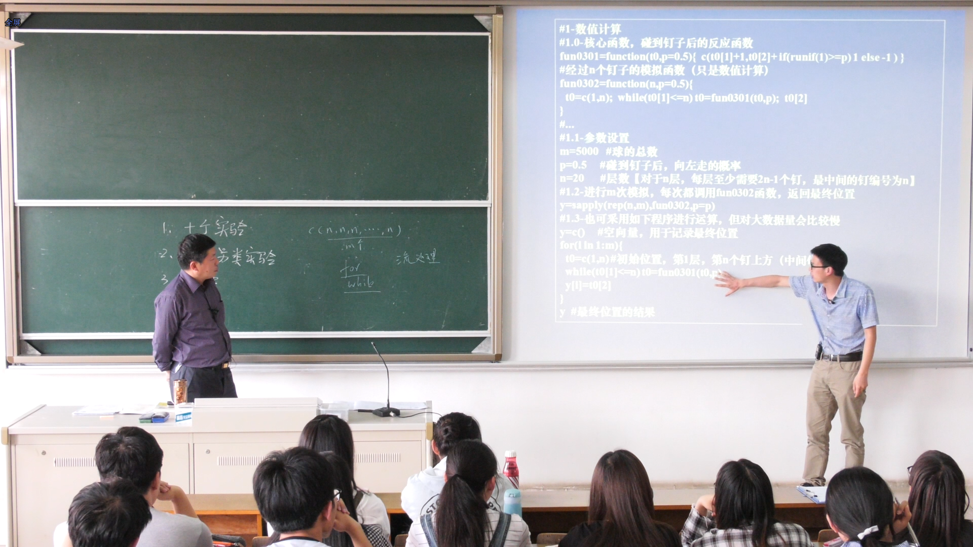 此次教改选择了统计实验三(概率模型实验)作为试点,由王庚和詹鹏两位老师合作进行。针对教学计划中的10个概率模型小实验,先由王庚老师讲解背景、原理、问题,随后则由詹鹏老师讲解相应的R语言编程与实现。在讲解中交流互动与问题回答穿插进行,课堂气氛热烈,同学们在满满的新鲜感中掌握了相应的专业知识。