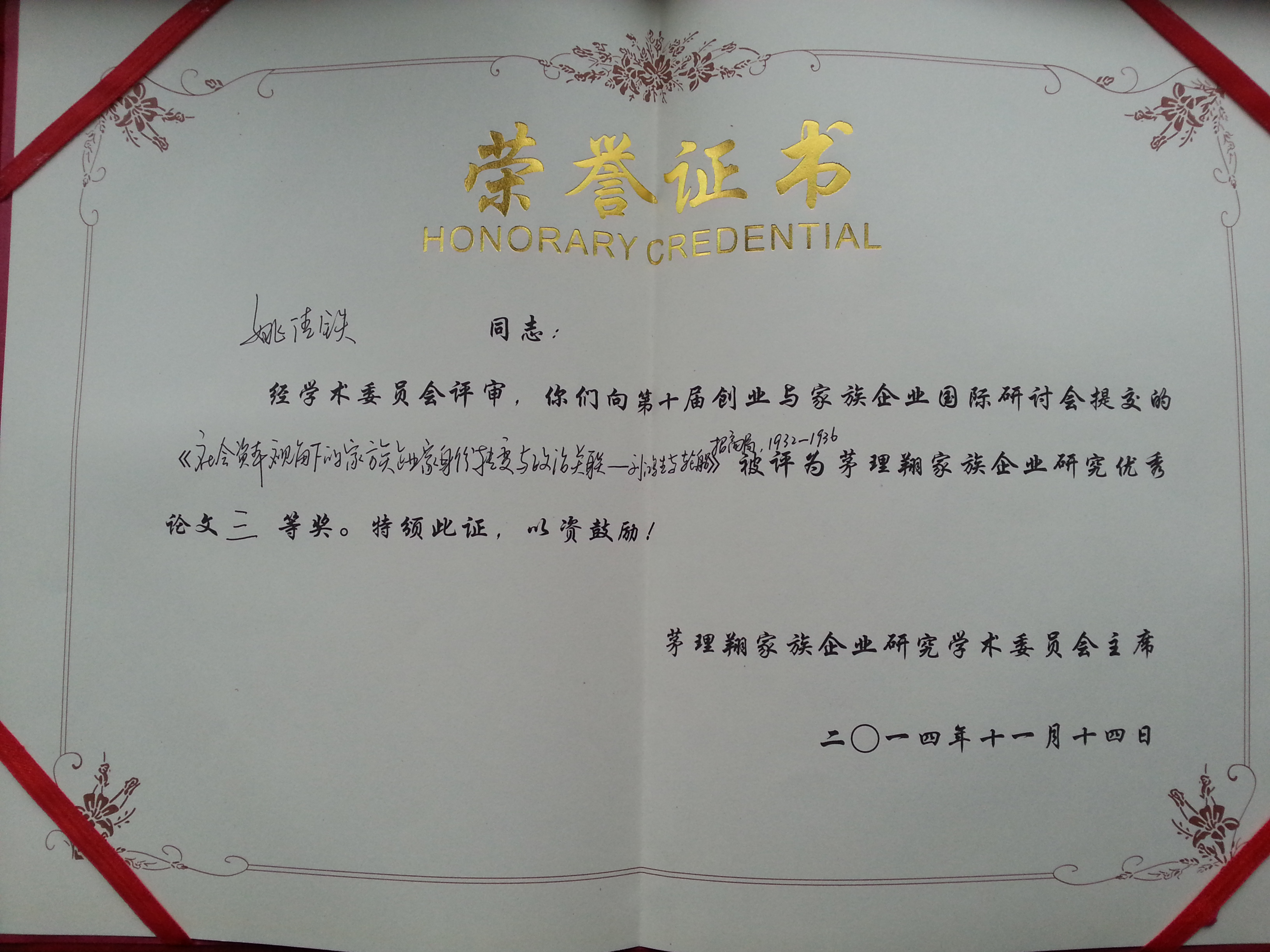 姚清铁博士长期从事家族企业和企业史研究,这也是他继2011年获得茅理翔家族企业研究论文二等奖之后再次获得该奖项。