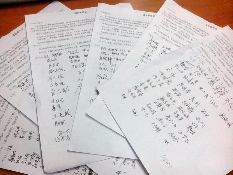 在13级新生中开展了诚信教育签名活动。从我做起,从现在做起,同学们庄严地做出如下承诺: