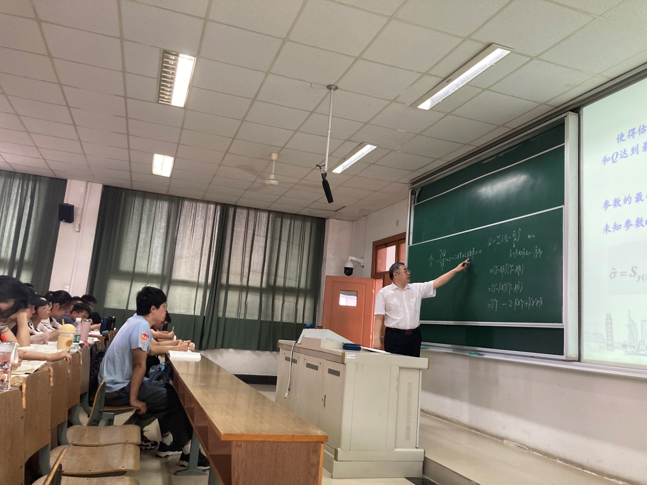 在一元回归的基础上引入多元回归,陈书记以“学习成绩的影响因素”为例启发学生思考,因与学生学习生活息息相关,学生踊跃回答,从多个方面梳理了相关影响因素。在讲述到多元回归的一般模型时,陈书记引入耳熟能详的“盲人摸象”典故,由此指出在建立回归模型时要综合考虑,整体把握,绝不能片面化。进而指出,统计学的本质是基于观察到的表面现象,寻找现象背后的本质规律。陈书记还以“摸着石头过河”形象地讲解了最小二乘估计思想。“摸着石头过河”,是一句反映以邓小平为核心的党的第二代领导集体在没有先例可循的情况下,奋力开创改革开放新征程的光辉名言。陈书记指出,收集到的数据好比“石头”,适合的模型好比“过河”的路径。