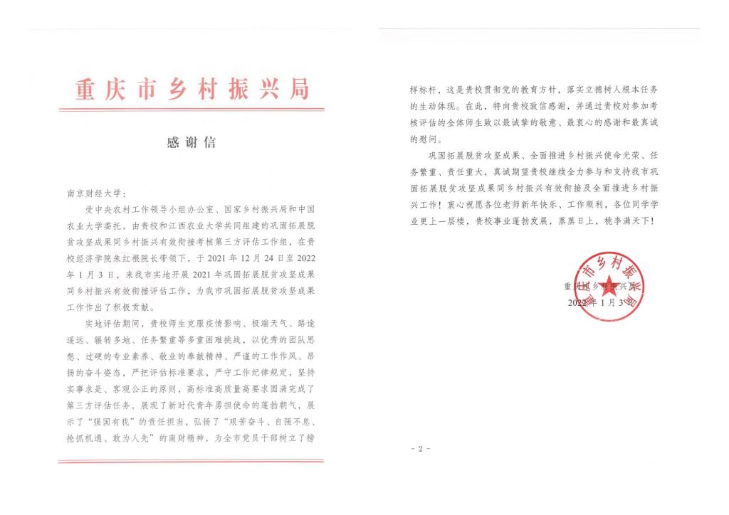 通力配合,确保评估工作顺利完成。评估期间,朱红根教授作为第三方评估组组长,带领团队克服疫情、极端天气等多重困难挑战,完成了4县抽查工作,调查涉及57个乡镇、79个行政村,开展座谈访谈187次,共计访谈324人,入户调查1645户农户。评估过程中严把评估标准要求、严守工作纪律规定,坚持实事求是、客观公正的原则,高标准高质量高要求圆满完成了第三方评估工作。评估工作得到了重庆市委、市政府的高度赞扬,并委托重庆市乡村振兴局专门给海立方娱乐城