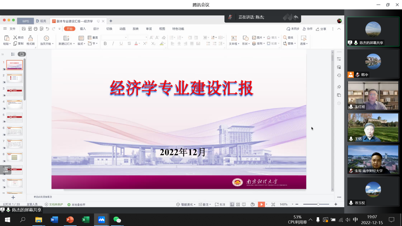 朱红根院长、韩中副院长、经济系主任陈杰、统计系主任程恭品和教学秘书陈祉岐参加了会议,会议由朱红根院长主持。