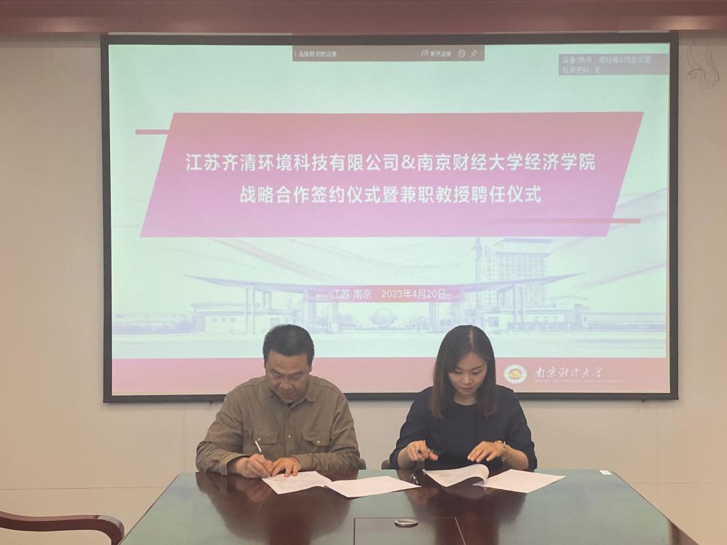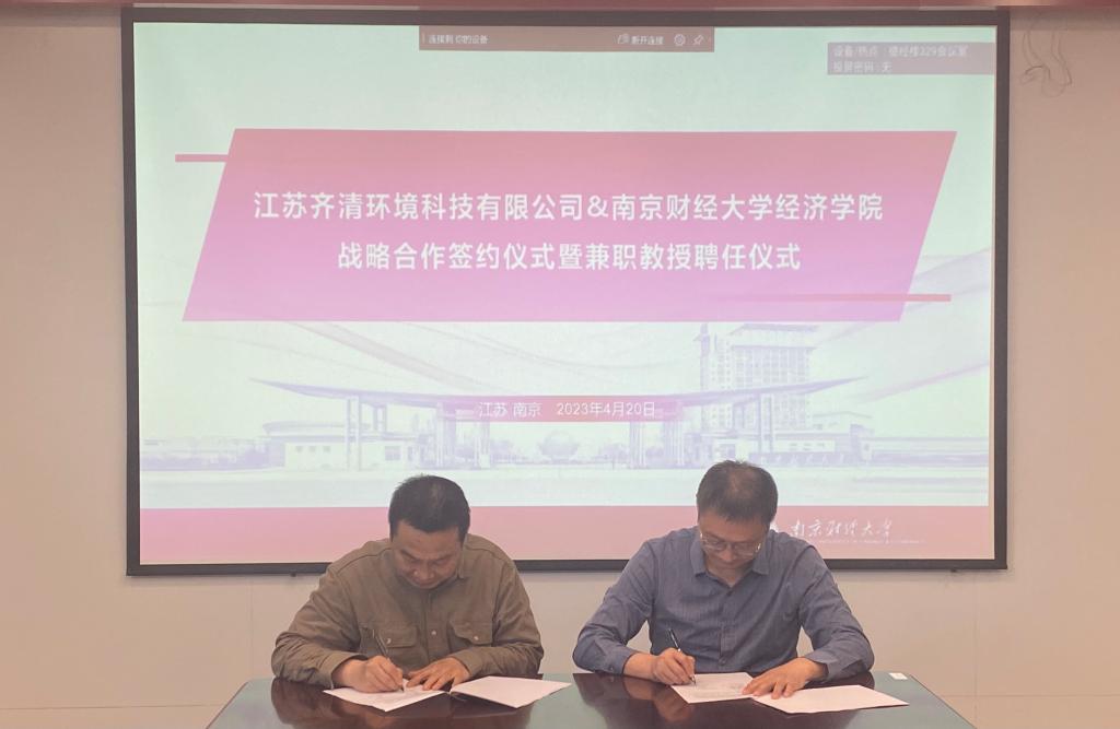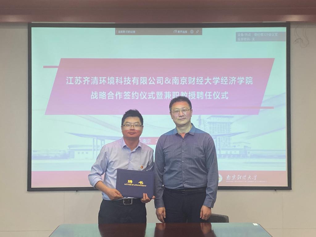 与江苏齐清环境科技有限公司实习就业基地共建协议》,并聘任王志良董事长、李建军副总经理为绿色经济发展研究院兼职教授。根据协议,双方将在碳经济与管理交叉学科人才培养、师资队伍建设,碳经济理论与实践研究,流域环境治理、生态环境政策咨询,实习就业基地建设等方面开展深入合作。