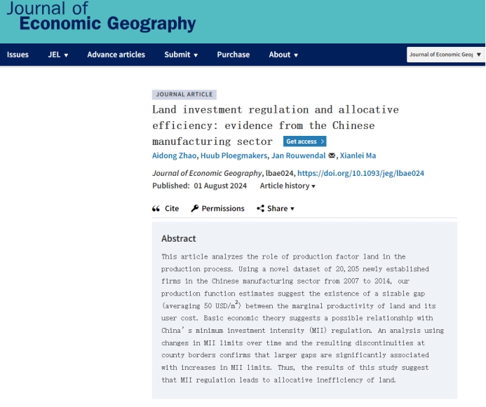 赵爱栋博士与荷兰阿姆斯特丹自由大学等学者的合作论文“Land investment regulation and allocative efficiency: Evidence from the Chinese manufacturing sector”被城市与区城经济学国际顶级期刊Journal of Economic Geography正式接受发表。海立方娱乐城