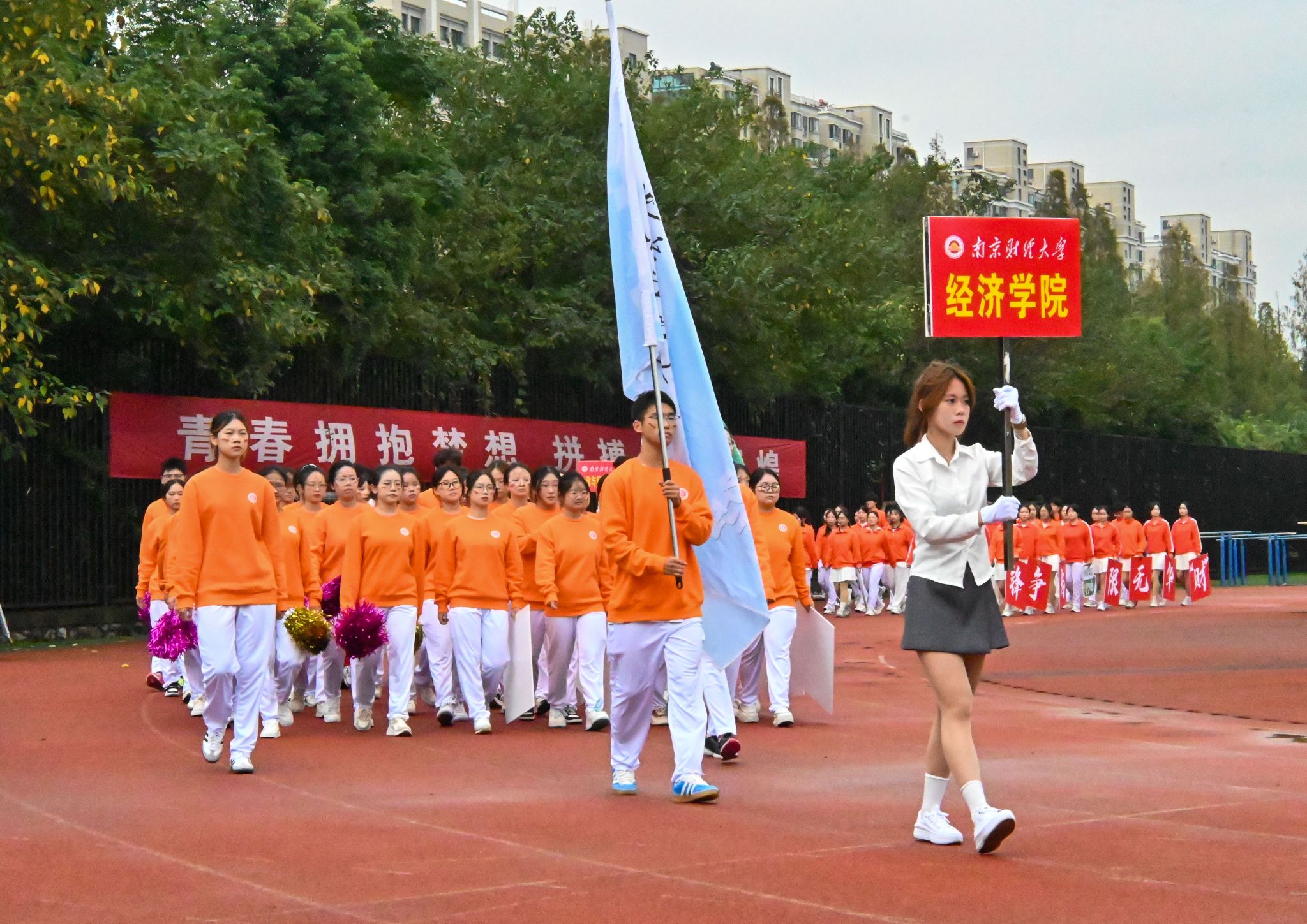 方阵的同学们昂首阔步地向主席台走去,步伐整齐地展示着他们朝气蓬勃的精神面貌。“经世济民展风采,携手同行创未来;竞技场上显身手,拼搏赛场铸辉煌”,经院方阵的口号响彻云霄,奋进激昂。