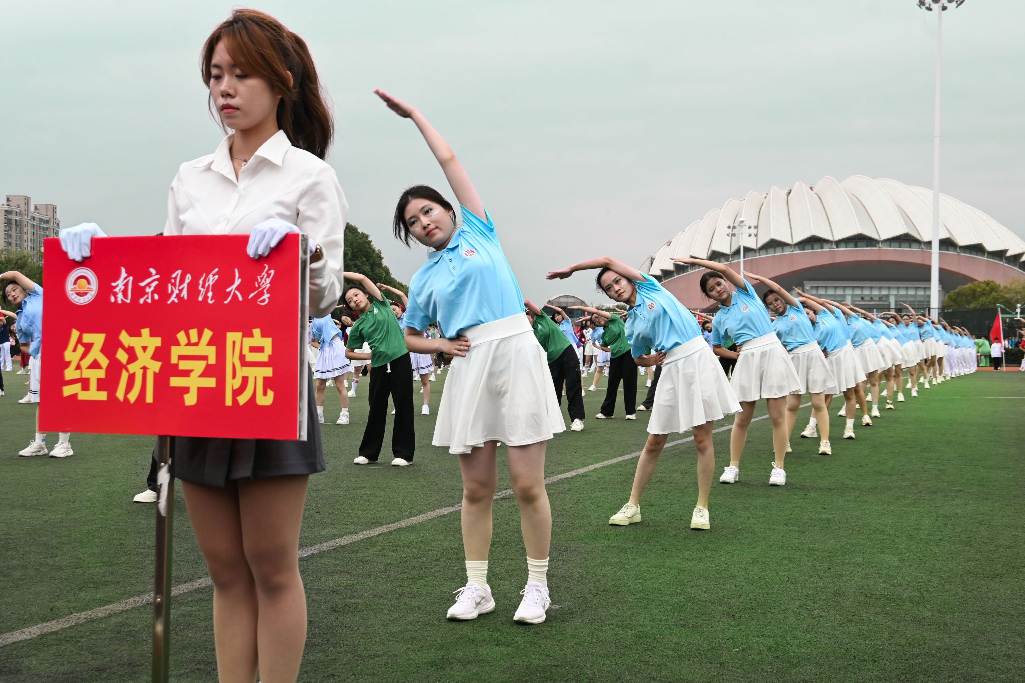 广播操选手们脸上洋溢起自信阳光的笑容。他们的动作整齐有力,步伐活力四射,尽情展现着经院学子的意气风发。