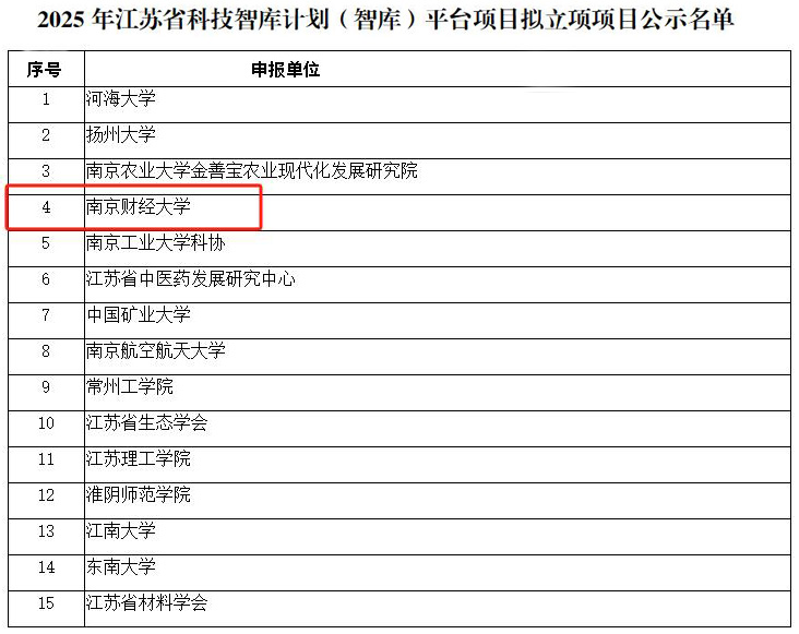 、东南大学、南京航空航天大学与南京农业大学金善宝农业现代化发展研究院等15家单位被认定为2025年度江苏省科技创新智库平台基地。科技智库计划(智库)平台项目的申报对象是省级学会(协会、研究会、促进会)、高等院校、科研院所、企业,以及从事科技决策咨询、建言献策工作的相关科研机构。
