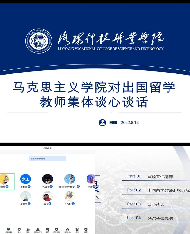 教工第二党支部书记张园园同志先在会议上解读了文件精神;出国留学老师分别汇报了近期思想、学习、生活情况;党支部委员和教研室主任对留学老师进行集体谈心谈话;最后由党总支书记汤家玉同志总结。此次谈心谈话会主要希望老师们要端正思想,树立正确的价值观,虽然身在国外,但是要始终心系国家,保持一颗爱国心。其次,告诫即将出国的党员同志要时刻谨记自己的党员身份,坚定信念,不忘初心,牢记使命,保持理性思维,注意自己的言行举止,要时刻维护党和国家的安全和荣誉,把国家的安全和荣誉放在第一位,忠于党和国家。最后,希望出国学习的党员同志可以发挥党员先锋模范带头作用,当其他老师遇到困难时及时伸出援助之手,尽己最大的力量给予帮助,充分发挥党员无私奉献的优良品质。同时也希望出国留学的老师们可以学有所成,早日回国为海立方娱乐城
