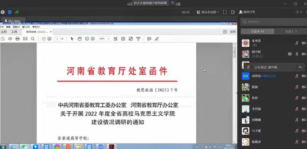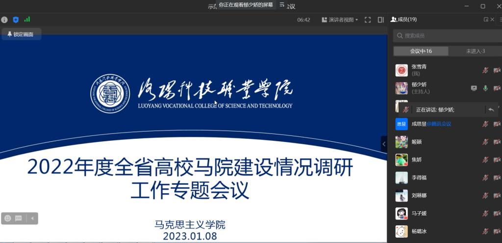 会议首先由副院长郁少娇带领大家共同研读全省高校马院建设情况调研文件,在此基础上明确了具体工作分工及时间节点,并对“示范性马院创建工作”的推进情况及存在问题进行研讨汇总。