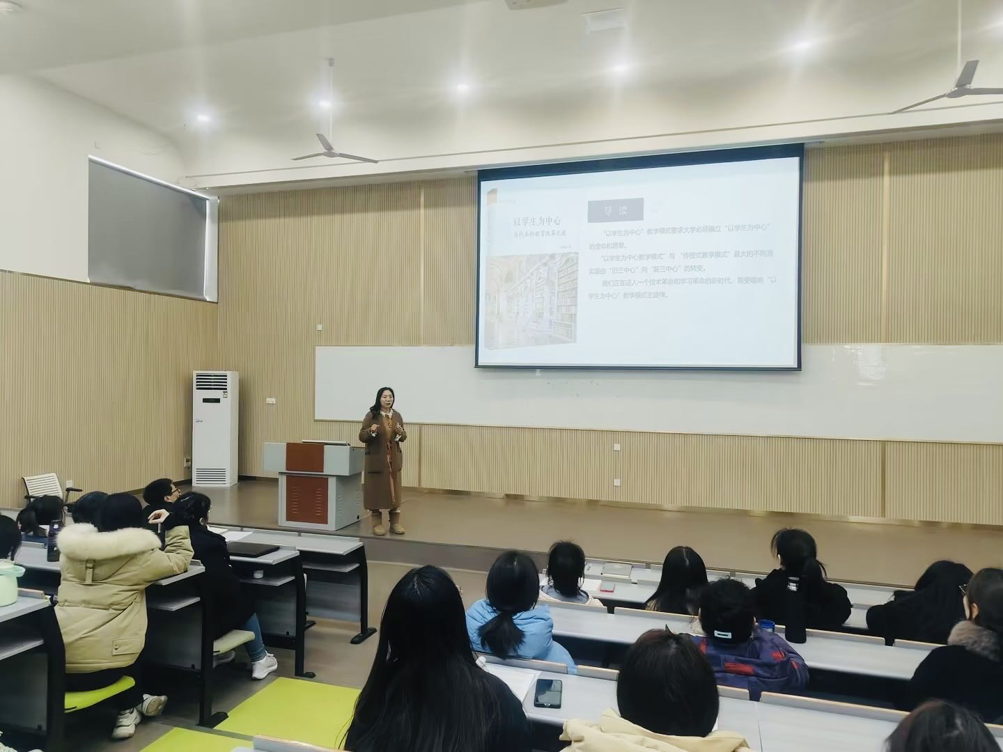 本次会议共包含两项内容,首先,刘琳娜院长就《以学生为中心——当代本科教育改革之道》这本巨著由浅入深地分享了自己的心得体会。学求其心得,业贵其专精。在分享伊始,刘院长借用清代张潮的《幽梦影》中金句“春读经,夏读史,秋读诸子,冬读集”来强调“只有多读健康有益的书,才能为自己幸福的将来奠定良好的基础”。随后刘院长从作者简介、导读、内容简介及科学基础几个方面详细解读了本书的核心思想并作出总结发言:“以学生为中心”的教育教学模式,一是关注学生发展,包括智力、道德、技能、思维、情感、意志等;二是关注学生的学习过程和学习效果,强调学生学习的重要性和责任意识。