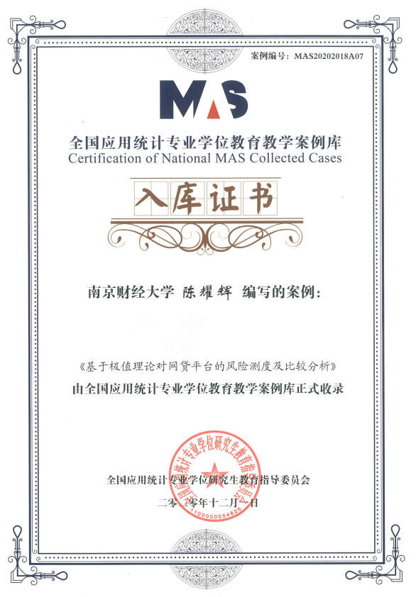 3、全国应用统计专业学位教育教学案例库入库案例:《基于极值理论对网贷平台的风险测度及比较分析》,编写人:陈耀辉。