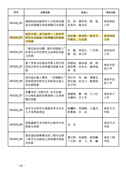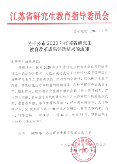 据悉,江苏省研究生教育改革成果奖旨在鼓励研究生教育教学实践工作中开拓创新、做出突出贡献、取得显著成效的集体和个人,促进研究生培养质量的持续提高,积极发挥优秀成果的示范、辐射作用。共有57项成果入选2020年江苏省研究生教育改革成果,其中,特等奖空缺,一等奖9项、二等奖16项、优秀奖32项。