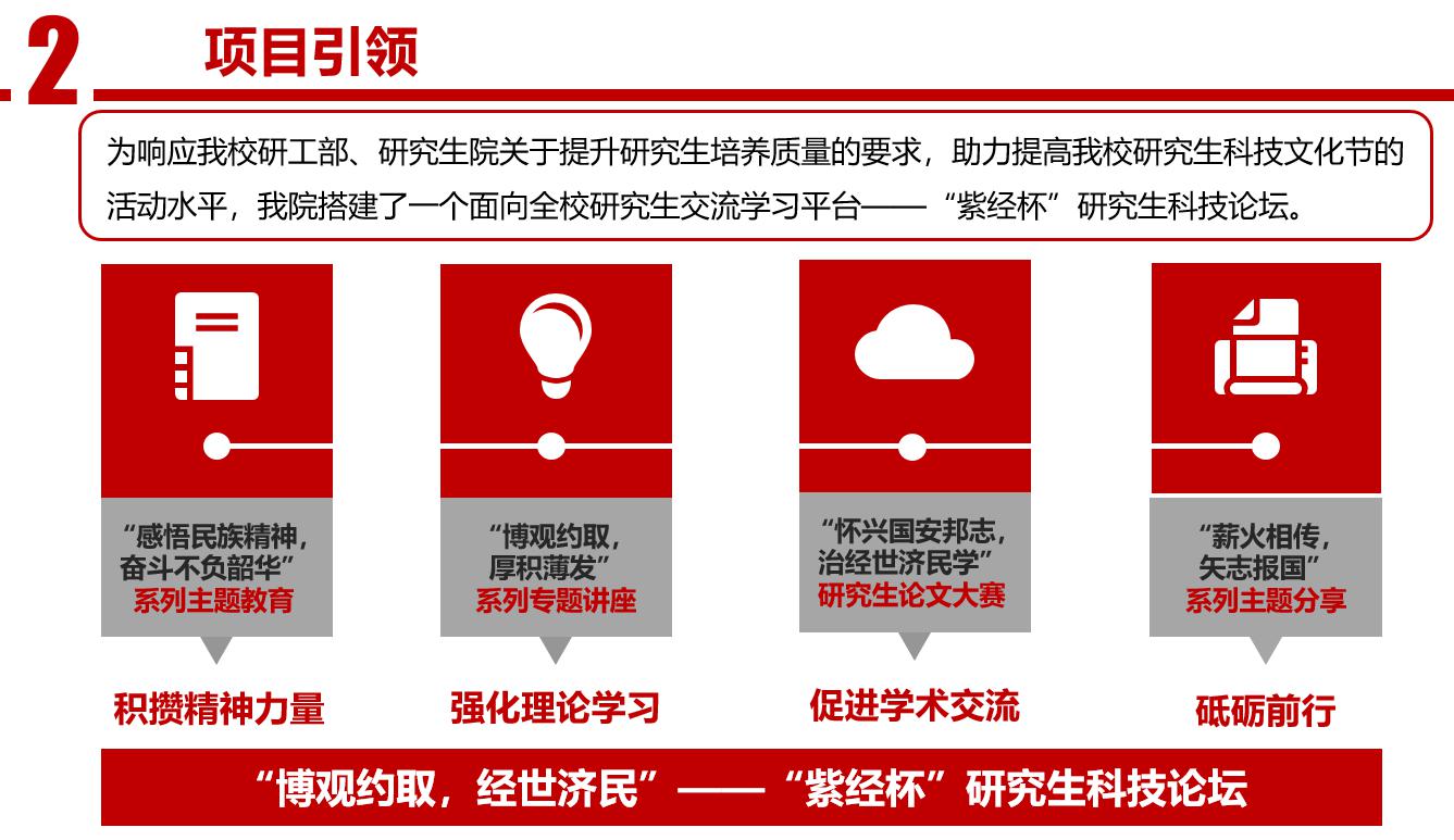 海立方娱乐城 举办的“紫经杯”研究生科技论坛共分为四个部分。第一部分是“感悟民族精神,奋斗不负韶华”系列主题教育活动,旨在帮助同学们积攒精神力量,点燃青年学生对于接棒新时代、承担祖国复兴重任的热情之火;第二部分是“博观而约取,厚积而薄发”系列学术讲座,旨在帮助同学们强化理论学习,拓宽学术视野;第三部分是“怀兴国安邦志,治经世济民学”研究生论文大赛,旨在给同学们提供一个展示自我、交流学术的平台;第四部分是“薪火相传,矢志报国”系列主题分享会,旨在启发同学们认清前路,砥砺前行。