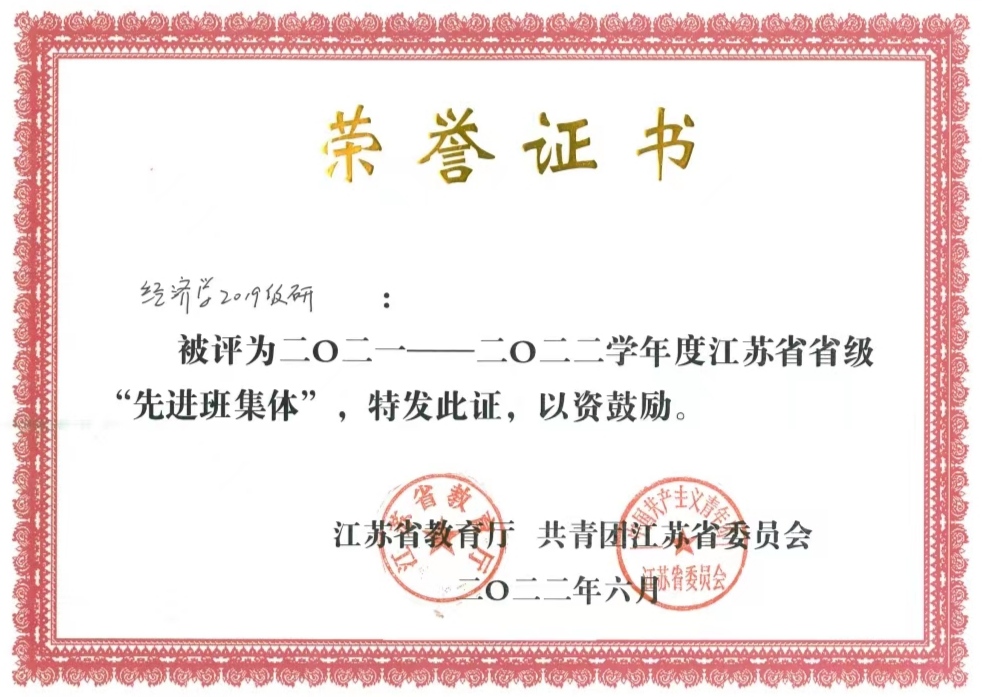经济学2019级研被评为江苏省普通高校省级“先进班集体”,2020级应用统计专业黄欣媛被评为江苏省普通高校省级“优秀学生干部”,2019级人口、资源与环境经济学专业王庆玲被评为江苏省普通高校省级“优秀毕业生”。