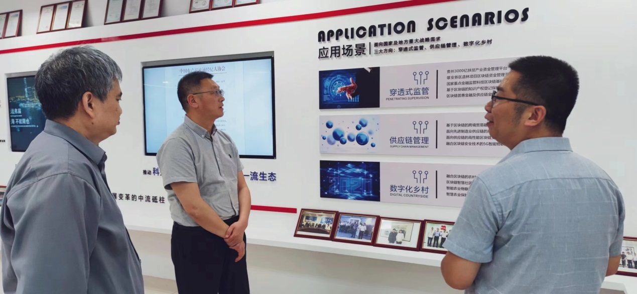 领导的到来表示热烈欢迎,并带领朱红根院长一行参观了中诚区块链研究院(南京)有限公司展厅,详细介绍了中诚区块链研究院的发展背景、基本情况及在金融监管、数字农业方面的应用场景。