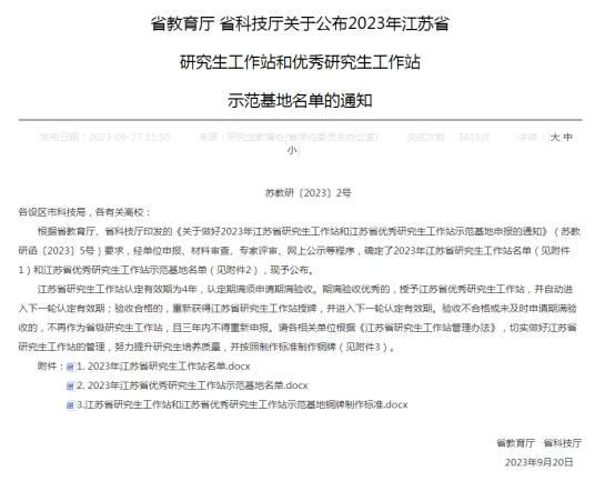9月27日,江苏省教育厅、科技厅印发《关于公布2023年江苏省研究生工作站和优秀研究生工作站示范基地名单的通知》(苏教研〔2023〕2号),经单位申报、材料审查、专家评审、网上公示等程序,确定了2023年江苏省研究生工作站名单。海立方娱乐城