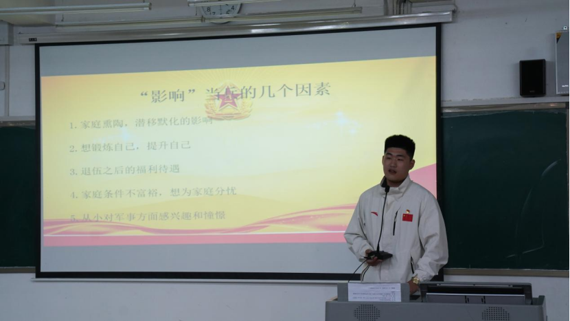2023届电子商务专业毕业生张森,曾于2020年参加过反法西斯战争胜利日的阅兵仪式,并于2021年参与了建党一百周年庆典活动。此次发表主题《铁骨铮铮保国家、不忘初心铸党魂——我的入伍生活》,以自己的亲身经历为学弟学妹们答疑解惑。听众对此反应热烈,纷纷举手提问,现场气氛催人振奋、庄严郑重,展现出当代大学生积极报效祖国、勇担时代使命的优秀精神面貌!