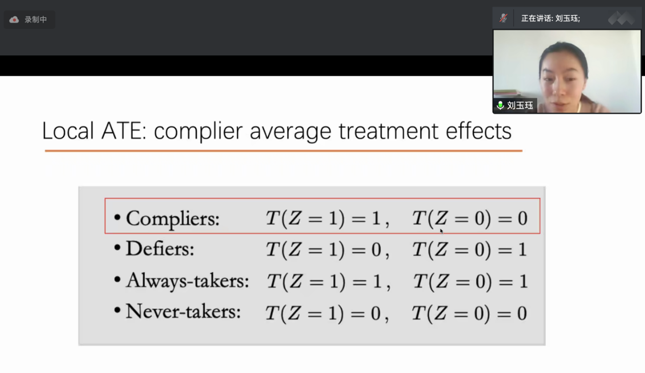 讲座由“自选择偏差”的基本概念引出。刘玉珏女士运用企业通过一个创新项目鼓励网约车新手司机参加企业平台培训的例子,来阐述在实证评估创新项目效果过程中所面临的由于无法随机分配项目可能导致的司机自选择加入问题。这类问题在实证因果推断中较具有普遍性。随后,她着重介绍了如何在实验设计阶段通过有效构建外生工具变量(IV)并运用到实证分析中去解决自选择偏差问题,从而准确估计出该创新项目的因果效应。