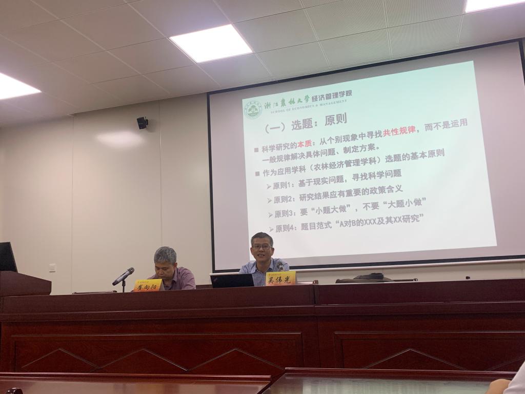 吴伟光院长主要讲述了基金选题与申报文本撰写(以自然经济为例)和经济学论文选题与主要问题两方面的内容。首先,在基金选题与申报文本撰写部分,吴院长把国家自科基金项目划档标准作为话题切入,详细地介绍了一篇优秀的基金项目的选题应当如何从科学问题或学科发展前沿出发;在文本撰写方面,吴教授更为细致地在研究背景与意义、文献综述、研究目标与内容、拟解决的关键问题等多个部分纠正了错误的问题示范并提供了合理的写法,对字数、语言技巧甚至是参考文献数量都提出了专业的建议。随后,在更贴合研究生写作日常需求的经济学论文选题与主要问题模块,吴教授阐述了经济学论文的基本要求,并对论文选题如何形成“卖点”提供了多个角度的思路,在论文需要重点关注且容易出纰漏的引言、理论框架、研究方法等多个部分中,吴教授提供了基本的写作模式,并提醒研究生同学注意避免错误写法。最后,吴教授预设了投稿时研究生同学们会遇到的问题并亲切地建议大家多练、多看,培养抗打击能力。