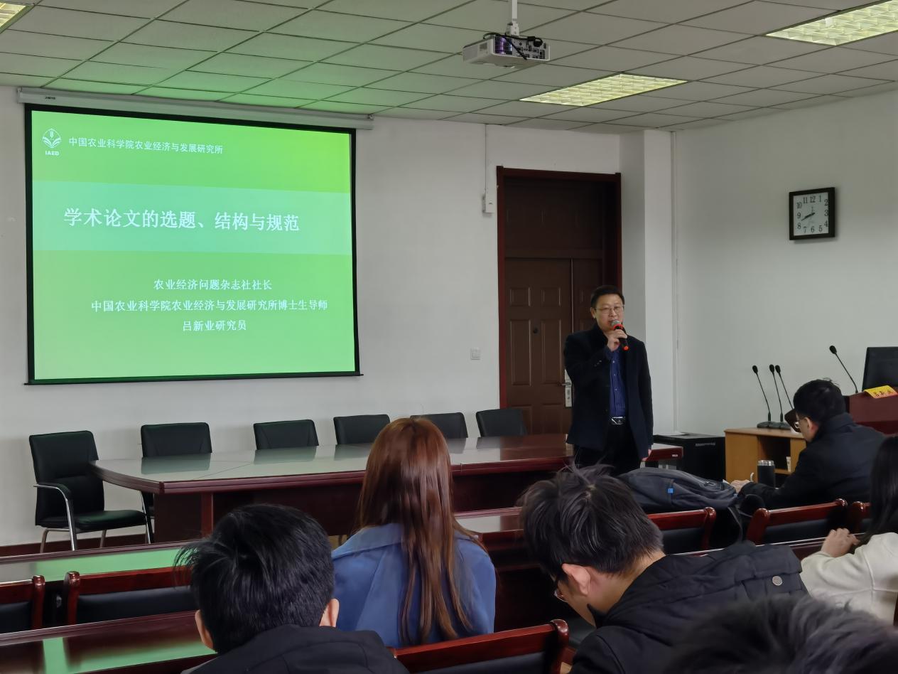 吕新业研究员首先介绍了《农业技术经济》和《农业经济问题》期刊的发展概况和各自特点。随后,吕新业研究员依据杂志的不同需求阐释了具体的发表要求。吕新业研究员以两刊下一阶段选题重点为切入点,介绍了近期农业经济研究重要热点问题;以经济类论文写作中常见的问题和技巧为落脚点,结合两刊的投稿体例,从学术论文的引言、文献综述、研究方法、模型的运用以及政策建议等方面进行重点剖析,对选题的来源、原则、论文的结构进行了深入浅出的讲解,并着重强调了论文写作和投稿过程中需要特别注意学术规范和学术道德问题。