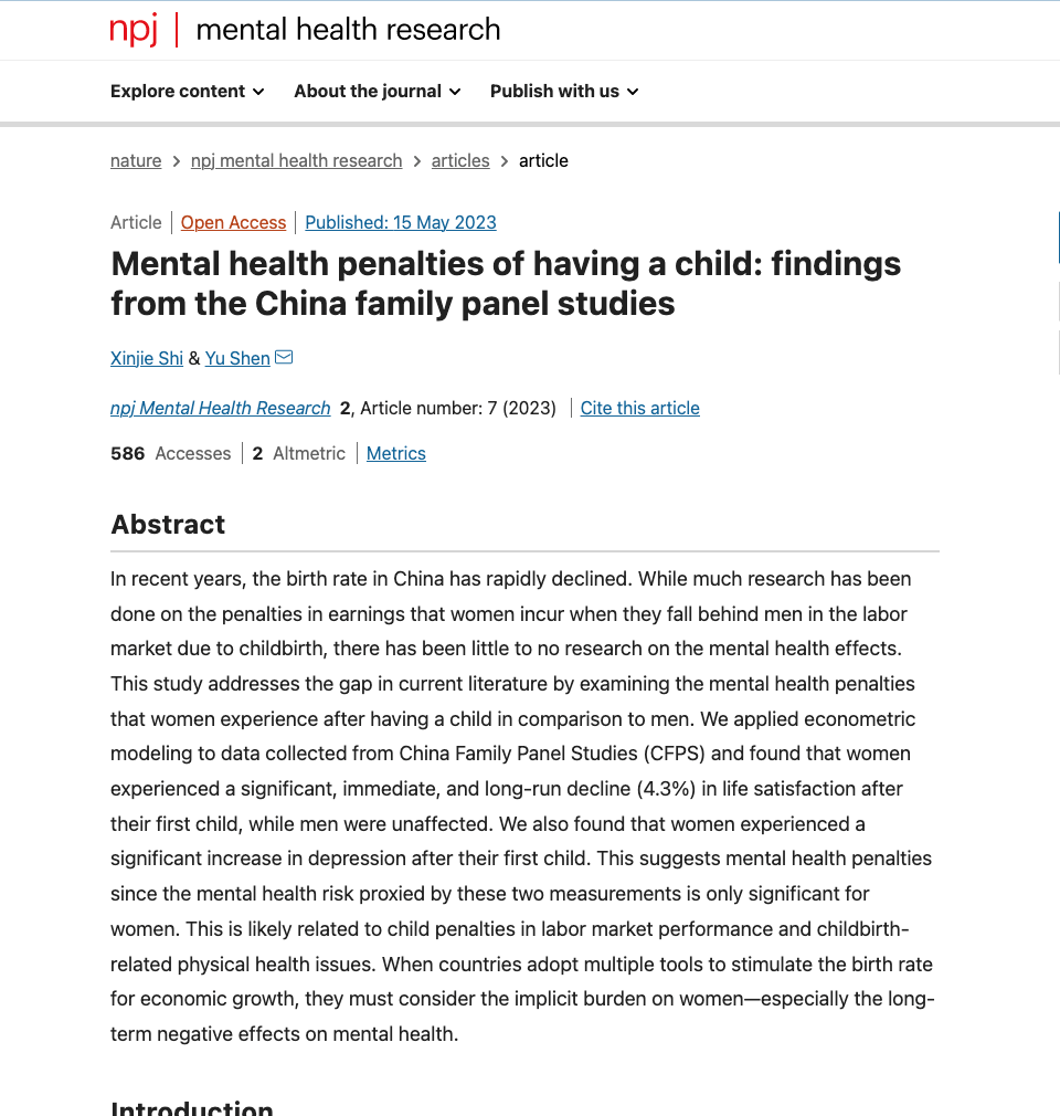 沈煜作为通讯作者,与浙江大学中国农村发展研究院史新杰研究员合作的论文《Mental health penalties of having a child: findings from the China family panel studies》被Nature旗下子刊npj Mental Health Research录用并在线发表。