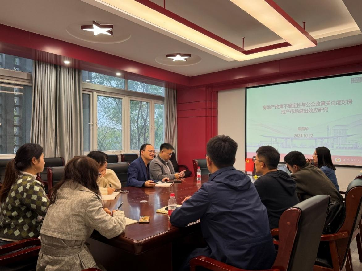 在德经楼会议室329举办了双周学术论坛。本期论坛由陈燕华老师带来主题为“房地产政策不确定性与公众政策关注度对房地产市场溢出效应研究”的学术交流。陈杰副教授主持了本次学术论坛,海立方娱乐城