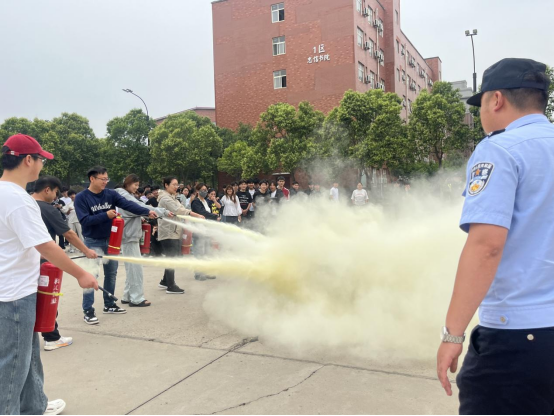 在全体师生安全撤离至至善大厦西侧小广场集合后,保卫处人员为大家进行了灭火器使用的现场演示。他们详细讲解了灭火器的操作步骤和注意事项,包括如何提起灭火器、拔掉保险销、握住喷管以及按压把手进行灭火等关键环节。为了让师生们更好地掌握操作技巧,保卫处人员还邀请了部分学生和教师上台进行实践操作。在专业人员的耐心指导下,大家亲自体验了使用灭火器灭火的过程,切实感受到了正确操作灭火器在火灾初期扑救中的重要性。