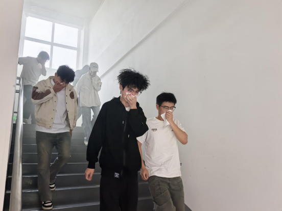 当日早上8:59,保卫处人员准时在格物楼指定位置点燃烟雾弹,模拟火灾现场。9 点整,尖锐的警报声瞬间响彻整个校园,拉开了本次演练的序幕。格物楼各班任课老师反应迅速,立即组织学生有序疏散。同学们在老师的引导下,用湿毛巾捂住口鼻,弯腰低姿,按照预定的疏散路线,快速且有序地向安全区域撤离。整个疏散过程中,师生们紧张而不慌乱,动作规范,展现出了良好的应急反应能力和团队协作精神。