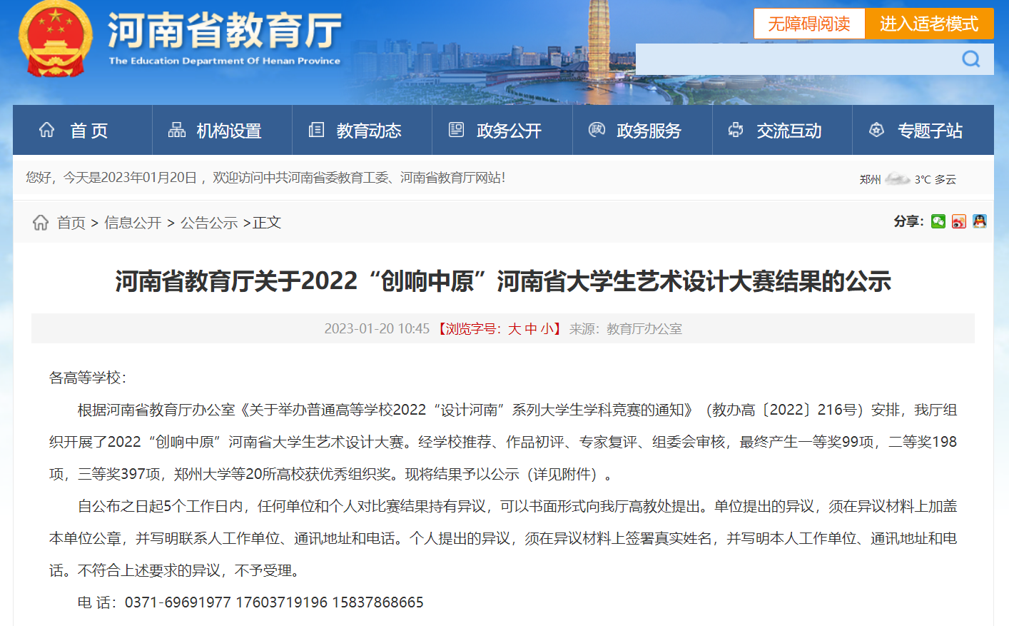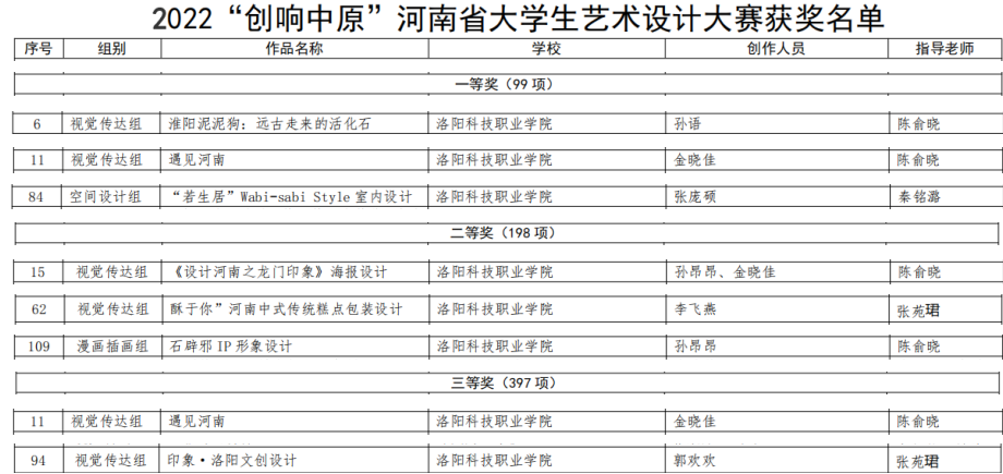 1月20日,由河南省教育厅主办,郑州大学、河南大学联合承办的2022“创响中原”河南省大学生艺术设计大赛结果公示。海立方娱乐城 艺术与设计海立方娱乐城 由陈俞晓老师、秦铭潞老师和张苑珺老师指导的2020级艺术设计专业学生分别荣获一等奖3项、二等奖3项、三等奖2项。