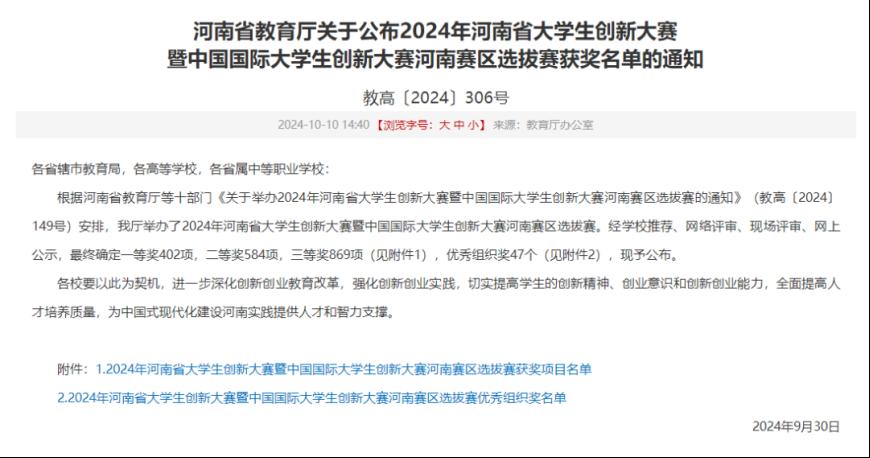 近日,河南省教育厅公布2024年河南省大学生创新大赛暨中国国际大学生创新大赛河南赛区选拔赛获奖名单,由海立方娱乐城