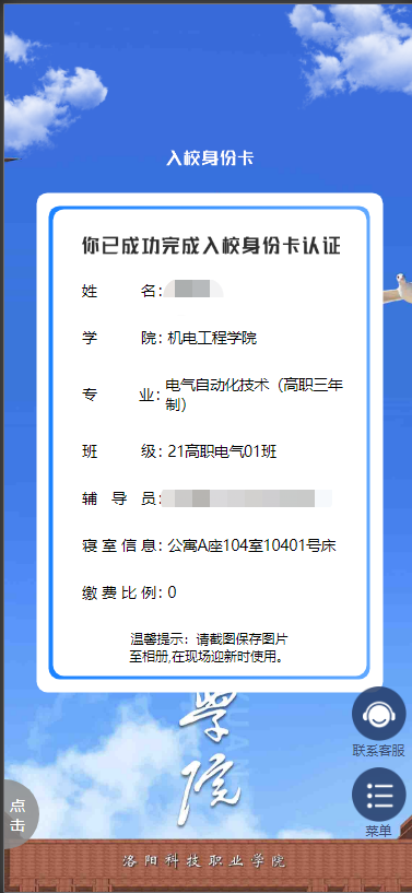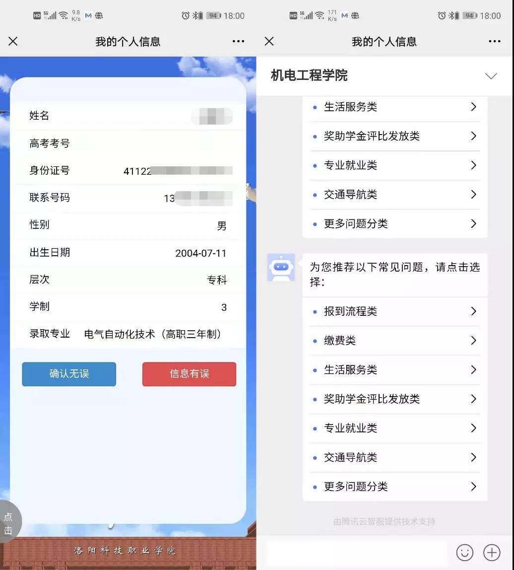 进入数字洛科官方公众号,点击公众号下方中部“新生报到-新生报到”进入迎新系统页面