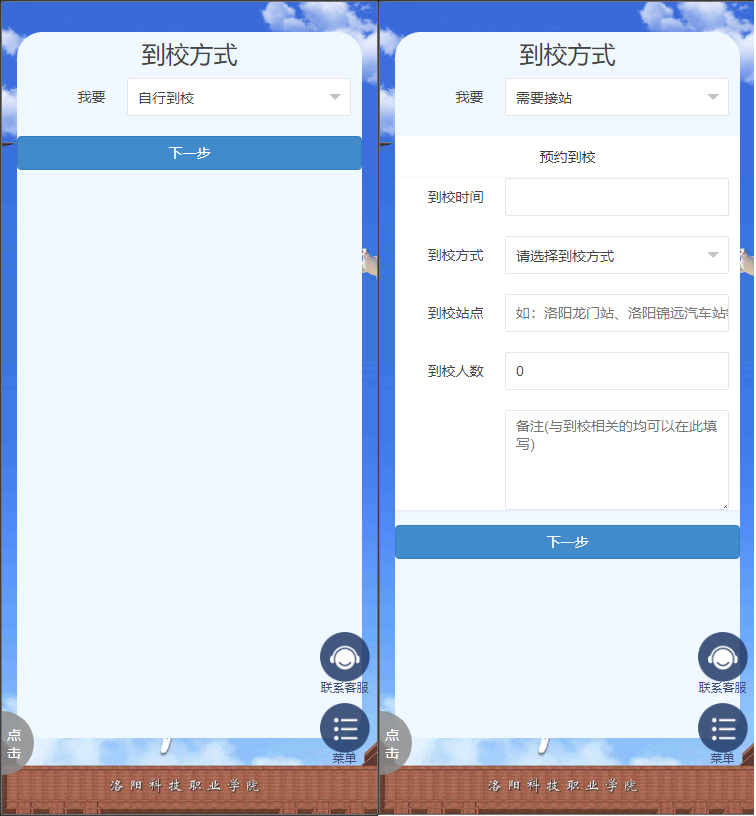 预约到校页面可以选择到校时间,填写到校方式(如高铁)、到达站点(如洛阳龙门站)、到校人数(如3、4、5),备注输入框可根据实际情况填写。