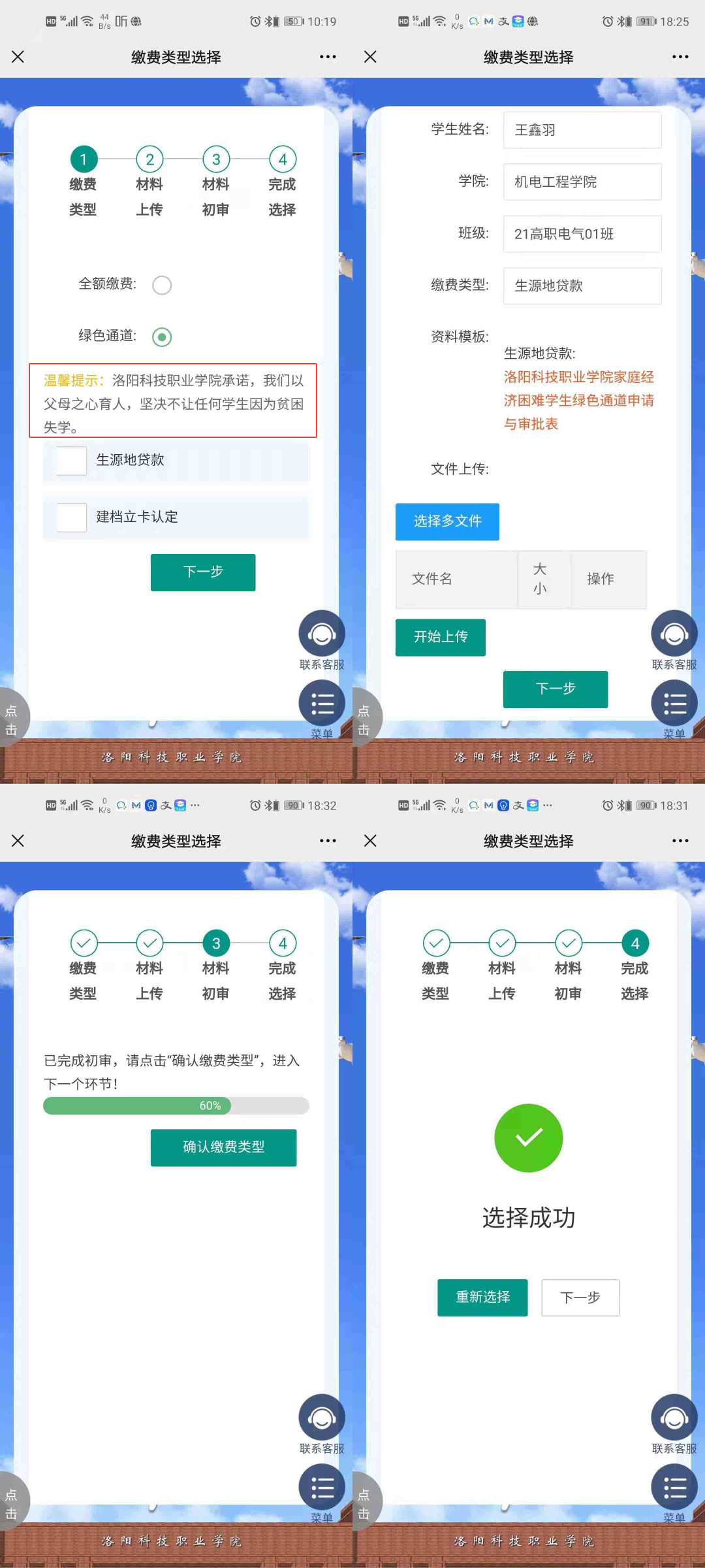 当选择“绿色通道”缴费类型时,需选择相应的选项,点击下一步进入文件上传页面,提交相关材料后点击“下一步”。