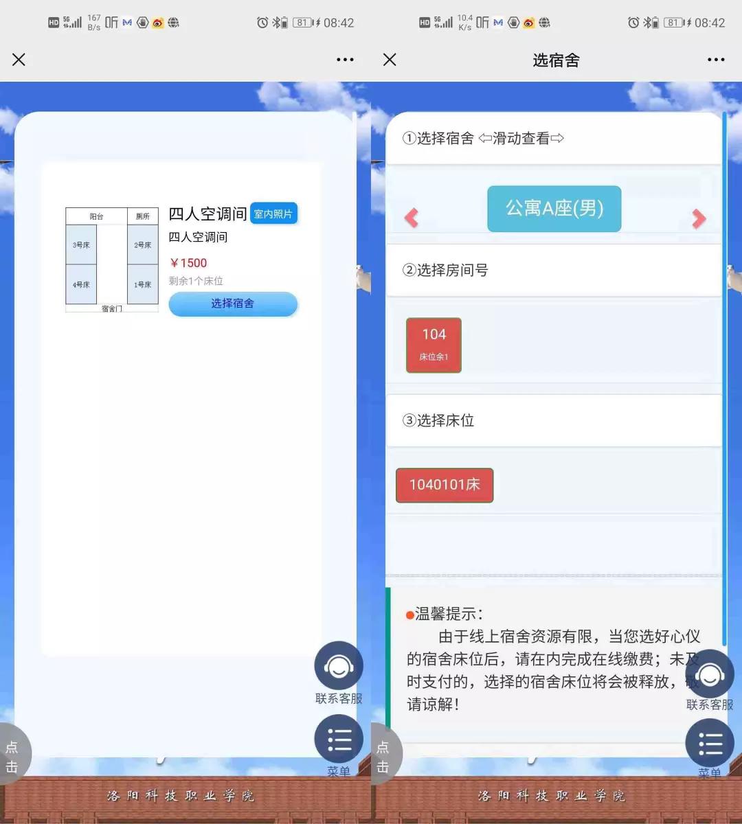 宿舍选择占用时间为1个小时,若一个小时内支付金额小于院校设置的最低缴费金额,宿舍占用资源自动取消。
