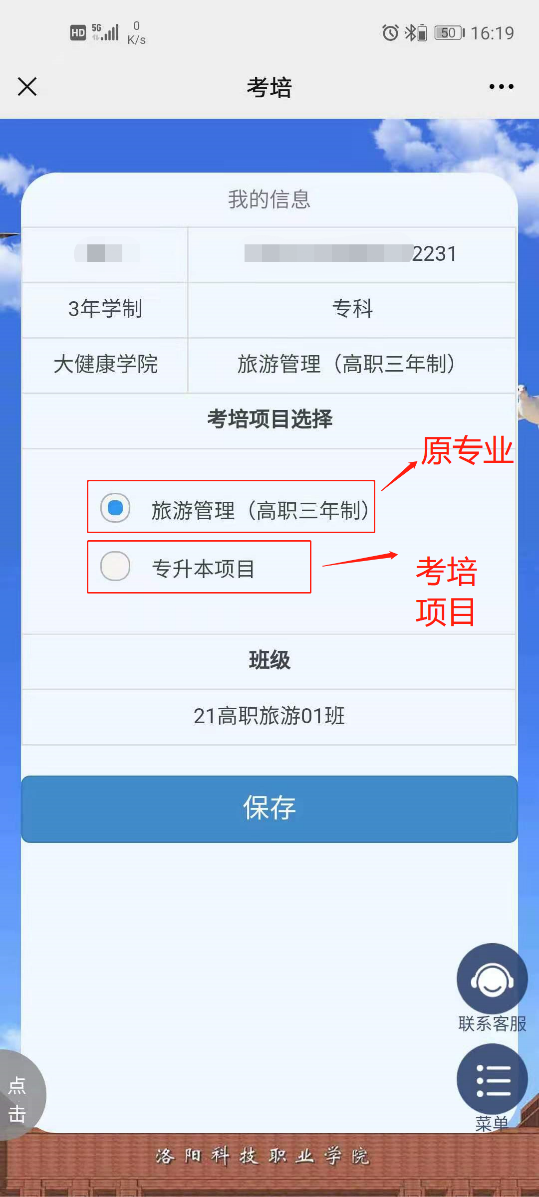如果学生有学历或技能提升等方面的需要,可根据实际选择相应的考培项目,然后点击“保存”进入下一步。