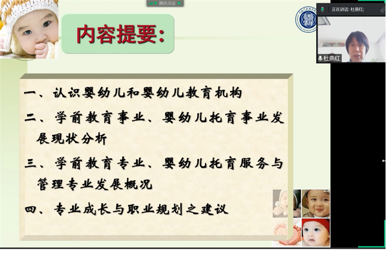 特邀顾问杜燕红教授为新生做《学前教育和婴幼儿托育专业导引》专题报告,从两大专业的现状和发展出发,向新生传递了正确的职业观、儿童观、教育观,使同学们认识到幼儿教师不仅要有专业知识,更需要有耐心、爱心和责任心,坚定了学生的专业信念。杜教授还给新生提出专业成长指导和职业规划建议,鼓励同学们要早做规划,打好专业基础,适应发展要求,提升综合素质。