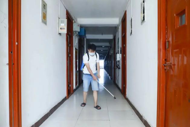 公寓中心的工作人员每天都会背着蓝色的喷雾器,对公寓各处进行仔细的消毒、消杀,“疫”无反顾,默默守护。