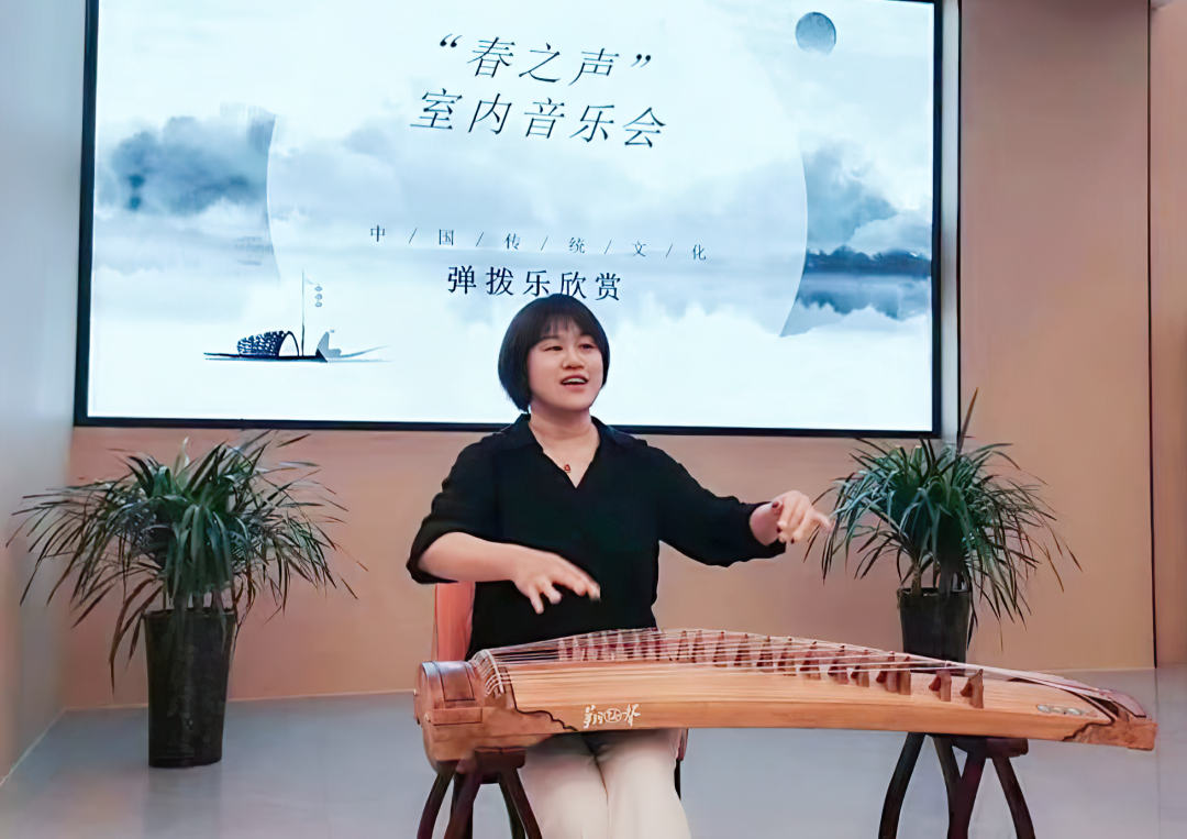 赵怡娜与同学们分享了自己在练筝的过程中,逐渐感受到古筝所蕴含的传承千年的美感和独属于古人寄思传意的意蕴。她以演前导赏的形式演奏了《满江红》和《渔舟唱晚》,让大家透过音乐去感悟晚霞辉映下渔人载歌载舞而归的动人画面。器乐小品《秋夜思》将秦腔传统音乐与现代演奏技巧相结合,充分发挥了古筝自身在音乐及韵味上的特色。表演结束后,赵怡娜让现场学生积极参与互动,并教授大家古筝基本弹奏知识,现场艺术氛围愈发浓厚。