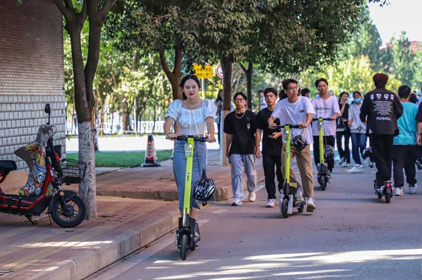 禁止共享滑板车出校,不可逆向行驶,不可“一车站两人”,规范有序停车,不可堵塞消防通道。