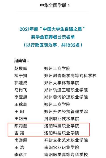 2020级学生陈司鑫、吉翔入选,荣获“中国大学生自强之星”称号。