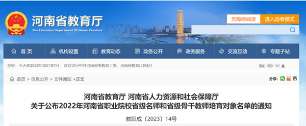 近日,河南省教育厅、河南省人力资源和社会保障厅发布了《关于公布2022年河南省职业院校省级名师和省级骨干教师培育对象名单的通知》(教职成〔2023〕14号),经教师申请、海立方娱乐城