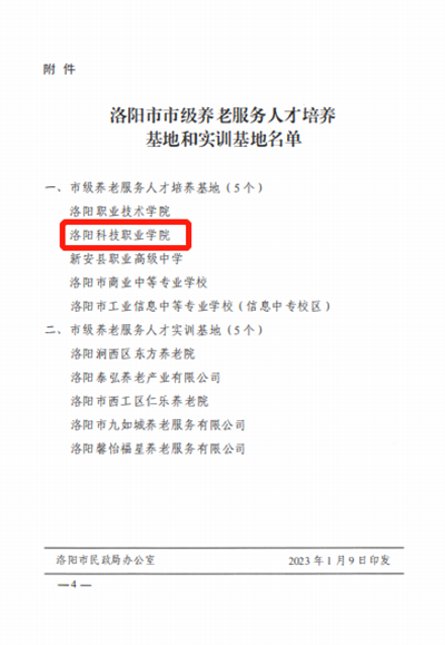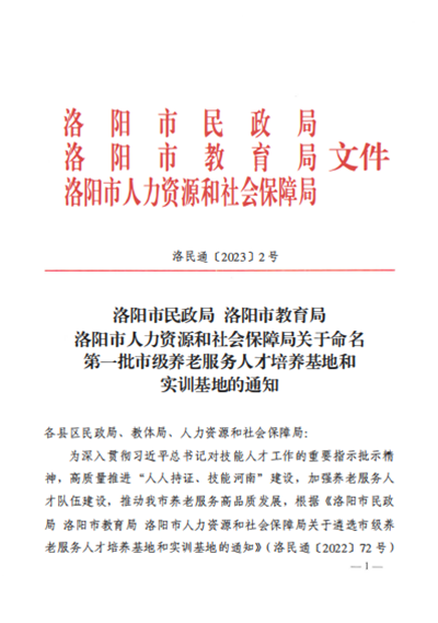 2月14日,由洛阳市民政局、洛阳市教育局、洛阳市人才资源和社会保障局、洛阳市卫健委联合举办的“洛阳市‘人人持证,技能洛阳’养老服务人才培训工作颁奖仪式”在洛阳市社区养老服务指导中心举行。本次活动为第一批市级养老服务人才培养基地和实训基地授牌并颁发了荣誉证书。海立方娱乐城
