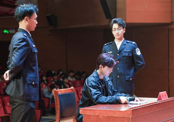 本次比赛的模拟案件有“校园贷诈骗案”“防卫过当案”等,模拟案件的全部角色均由学生扮演。晋级决赛的四支参赛队伍成员根据审判长、审判员、书记员、公诉人、辩护人、被告人、法定代理人、法警等角色分工,身着演出制服,现场模拟宣读起诉书、法庭调查、法庭辩论、被告人最后陈述、当庭宣判等环节。公诉方慷慨陈词,有理有据;辩护方据理力争、有条不紊;审判员耐心询问,居中审判,公正严明。整个模拟庭审过程气氛庄严,程序完备,高度还原了一次庭审的真实场景,以身临其境的方式为让学生沉浸式了解庭审过程,零距离感受法庭威严和法律公正。