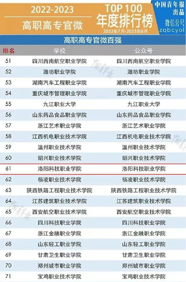 今日,在由中国青年报社主办的“融媒体时代的高校可视化探索研学会暨校媒精英汇”上,发布了2022-2023年度中国大学官微百强、高职高专官微百强及2022-2023年度全国卓越影响力职院可视化融媒团队等榜单。