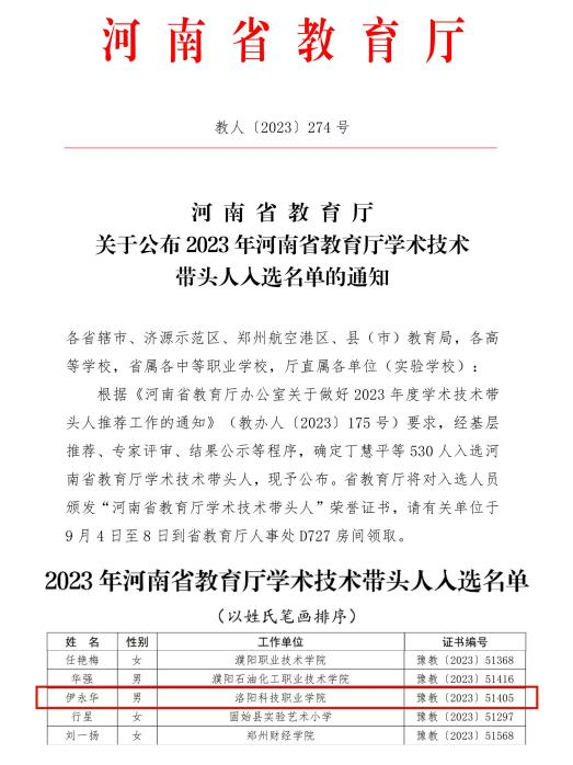 办公室主任伊永华荣获“河南省教育厅学术技术带头人”称号,成为洛科又一位获此殊荣的教师。