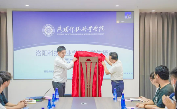 校长刘丽彬博士与学生代表曹志远共同为“学生椅”揭幕并合影留念。