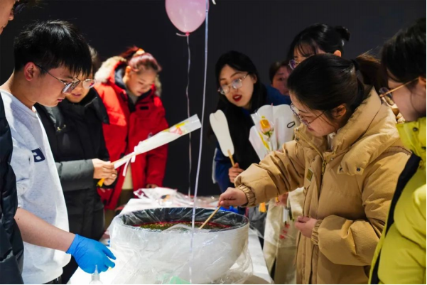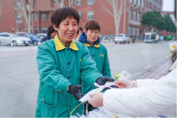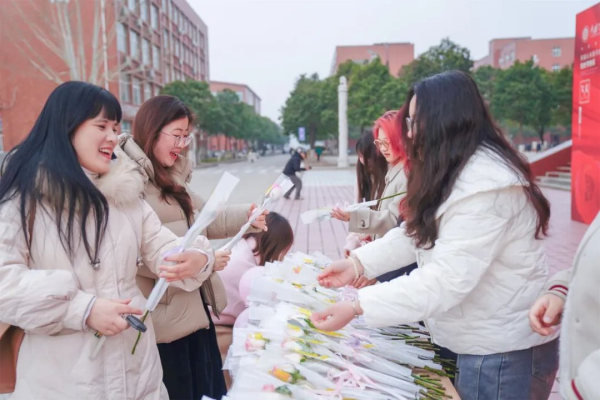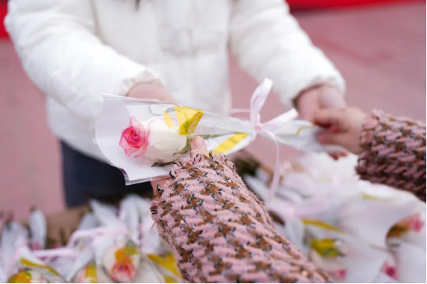 3月7日,校园洋溢着温馨浪漫的气氛,至善大厦前、三棵树广场、桃园餐厅3楼变身“玫瑰驿站”,那些包装精美的淡粉花束,正静候着洛科的她到来。全校的电子屏,让走过长廊的每位教师都能看见自己的名字在花丛特效中绽放。更隐秘的温柔藏在洗手台的桌摆牌。这些流淌在日常褶皱里的诗意,让领取玫瑰的队伍成了笑脸与目光的交汇处。